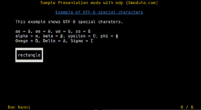 mdp是Linux下一款基于ncurses的命令行演示工具。我喜欢mdp在于它对markdown的支持,使得我很容易以熟悉的markdown格式来创建幻灯片。自然,它还可以很轻松地用HTML格式来发布幻灯片。另一个好处是它支持UTF-8字符编码,这让非英语字符(如希腊或西里尔字母)的展示也变得很方便。