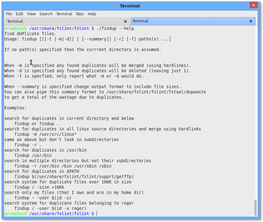 $ /usr/share/fslint/fslint/findup --help find dUPlicate files. Usage: findup [[[-t [-m|-d]] | [--summary]] [-r] [-f] paths(s) ...] If no path(s) specified then the current directory is assumed. When -m is specified any found duplicates will be merged (using hardlinks). When -d is specified any found duplicates will be deleted (leaving just 1). When -t is specfied, only report what -m or -d would do. When --summary is specified change output format to include file sizes. You can also pipe this summary format to /usr/share/fslint/fslint/fstool/dupwaste to get a total of the wastage due to duplicates.