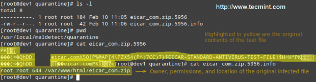 Linux恶意软件扫描报告其中021015-1051.3559是SCANID(SCANID与你的实际结果会略有不同)。 重要提示:请注意:由于eicar.com文件下载了两次(因而导致eicar.com和eicar.com.1),LMD发现了5次袭击。 如果你检查隔离文件夹(我只留下了一个文件,删除了其余文件),我们会看到下列结果: