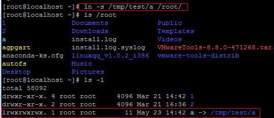 2、为a目录在root目录下创建一个软链接。