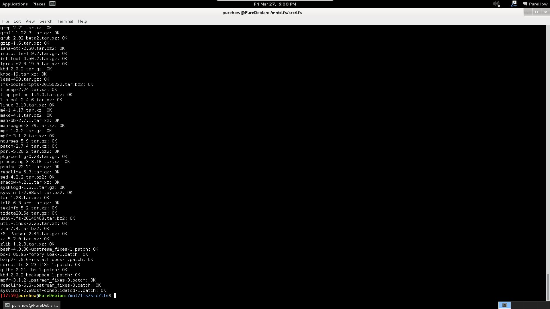 #md5sum lfs.tar.gz 124e1eb0e52f176ab84c38118b4975e3 ?lfs.tar.gz #tar zxvf lfs.tar.gz > /dev/null #pushd $LFS/src/lfs /mnt/lfs/src/lfs /mnt/lfs/src #md5sum -c ../md5sums acl-2.2.52.src.tar.gz: OK attr-2.4.47.src.tar.gz: OK autoconf-2.69.tar.xz: OK automake-1.15.tar.xz: OK bash-4.3.30.tar.gz: OK bc-1.06.95.tar.bz2: OK binutils-2.25.tar.bz2: OK bison-3.0.4.tar.xz: OK bzip2-1.0.6.tar.gz: OK check-0.9.14.tar.gz: OK coreutils-8.23.tar.xz: OK dejagnu-1.5.2.tar.gz: OK diffutils-3.3.tar.xz: OK eudev-2.1.1.tar.gz: OK eudev-2.1.1-manpages.tar.bz2: OK e2fsprogs-1.42.12.tar.gz: OK expat-2.1.0.tar.gz: OK expect5.45.tar.gz: OK file-5.22.tar.gz: OK findutils-4.4.2.tar.gz: OK flex-2.5.39.tar.bz2: OK gawk-4.1.1.tar.xz: OK gcc-4.9.2.tar.bz2: OK gdbm-1.11.tar.gz: OK gettext-0.19.4.tar.xz: OK glibc-2.21.tar.xz: OK gmp-6.0.0a.tar.xz: OK gperf-3.0.4.tar.gz: OK grep-2.21.tar.xz: OK groff-1.22.3.tar.gz: OK grub-2.02~beta2.tar.xz: OK gzip-1.6.tar.xz: OK iana-etc-2.30.tar.bz2: OK inetutils-1.9.2.tar.gz: OK intltool-0.50.2.tar.gz: OK iproute2-3.19.0.tar.xz: OK kbd-2.0.2.tar.gz: OK kmod-19.tar.xz: OK less-458.tar.gz: OK lfs-bootscripts-20150222.tar.bz2: OK libcap-2.24.tar.xz: OK libpipeline-1.4.0.tar.gz: OK libtool-2.4.6.tar.xz: OK linux-3.19.tar.xz: OK m4-1.4.17.tar.xz: OK make-4.1.tar.bz2: OK man-db-2.7.1.tar.xz: OK man-pages-3.79.tar.xz: OK mpc-1.0.2.tar.gz: OK mpfr-3.1.2.tar.xz: OK ncurses-5.9.tar.gz: OK patch-2.7.4.tar.xz: OK perl-5.20.2.tar.bz2: OK pkg-config-0.28.tar.gz: OK procps-ng-3.3.10.tar.xz: OK psmisc-22.21.tar.gz: OK readline-6.3.tar.gz: OK sed-4.2.2.tar.bz2: OK shadow-4.2.1.tar.xz: OK sysklogd-1.5.1.tar.gz: OK sysvinit-2.88dsf.tar.bz2: OK tar-1.28.tar.xz: OK tcl8.6.3-src.tar.gz: OK texinfo-5.2.tar.xz: OK tzdata2015a.tar.gz: OK udev-lfs-20140408.tar.bz2: OK util-linux-2.26.tar.xz: OK vim-7.4.tar.bz2: OK XML-Parser-2.44.tar.gz: OK xz-5.2.0.tar.xz: OK zlib-1.2.8.tar.xz: OK bash-4.3.30-upstream_fixes-1.patch: OK bc-1.06.95-memory_leak-1.patch: OK bzip2-1.0.6-install_docs-1.patch: OK coreutils-8.23-i18n-1.patch: OK glibc-2.21-fhs-1.patch: OK kbd-2.0.2-backspace-1.patch: OK mpfr-3.1.2-upstream_fixes-3.patch: OK readline-6.3-upstream_fixes-3.patch: OK sysvinit-2.88dsf-consolidated-1.patch: OK