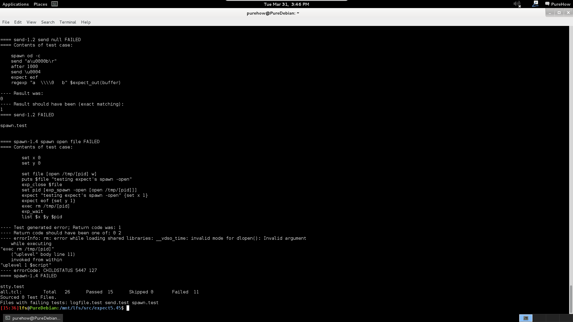 本次测试我们发现一共有26个用例,其中通过了15个,有11个失败了。不过在LFS 7.7的官方文档中有这么一句