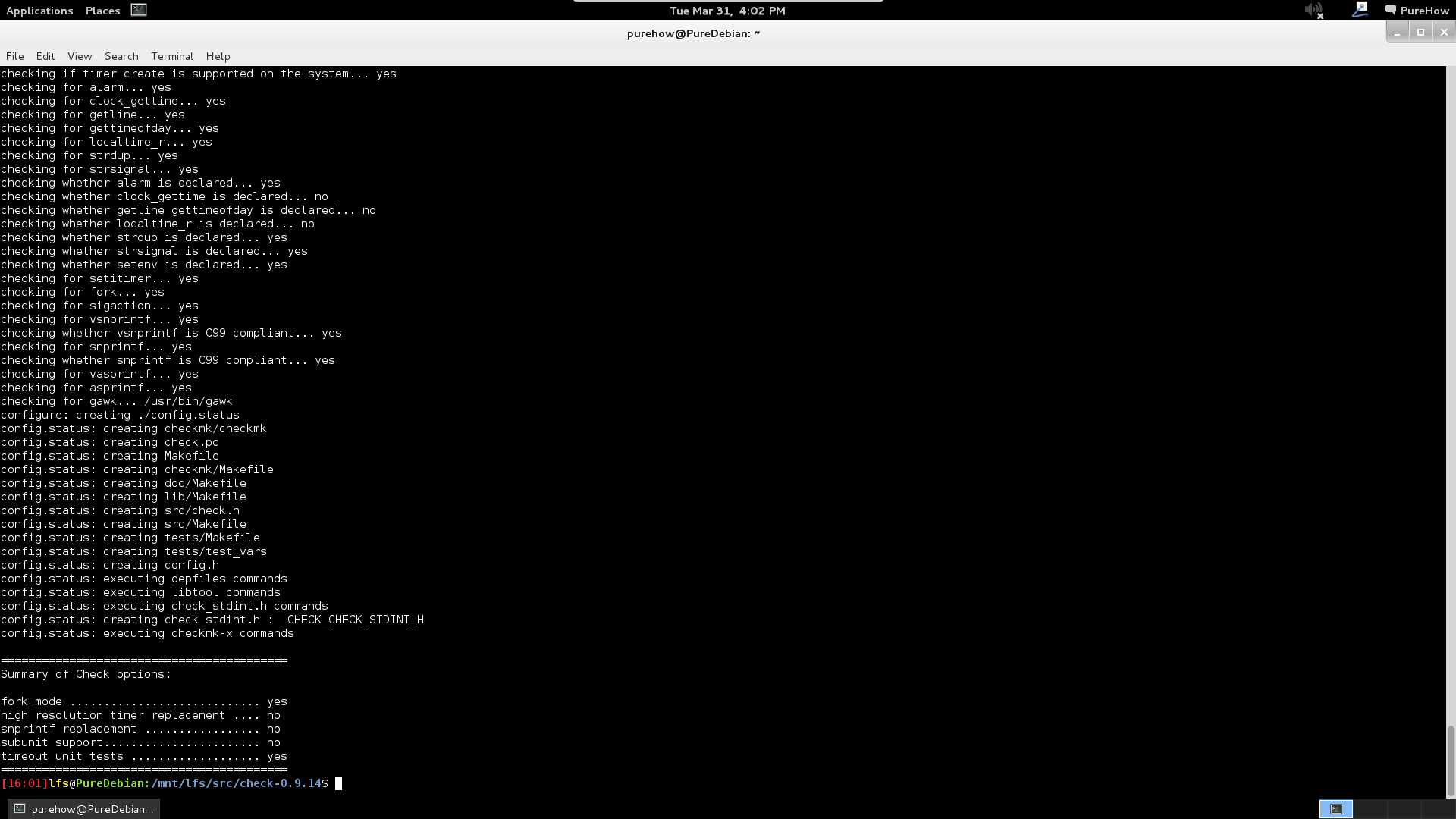 接下来是check的编译安装,check有点特殊的是,在配置编译选项的时候,需要将配置结果设置一个变量。回到$LFS/src,解压并进入源码目录