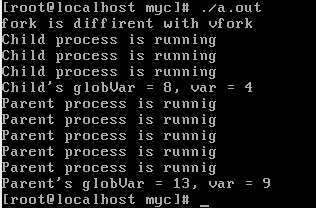 vfork()创建了子进程后,父进程中globVar和var都递增了8,因为vfork()的子进程共享父进程的地址空间,子进程修改变量对父进程是可见的。