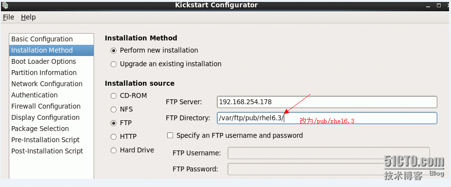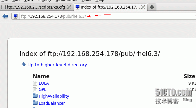 #打开浏览器看看是否可以访问ftp://192.168.254.178/pub/scripts/ks.cfg。还有就是确保红色箭头所指的路径可以访问到rhel6.3的镜像。