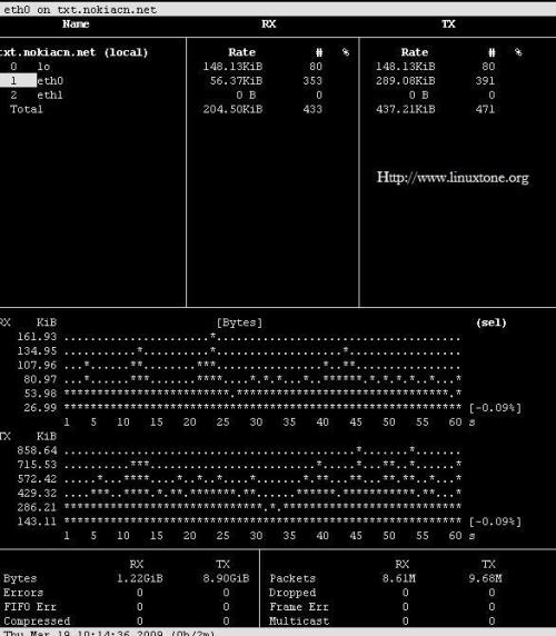 # rpm -Uhv http://apt.sw.be/redhat/el5/en/x ...1.el5.rf.x86_64.rpm # yum install bmon - bandwidth monitor 可以在 shell 下监控网络流量的状况( 具有动态效果 )