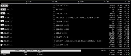 RX:接收流量 TOTAL:总流量 Cumm:运行iftop到目前时间的总流量 peak:流量峰值 rates:分别表示过去 2s 10s 40s 的平均流量