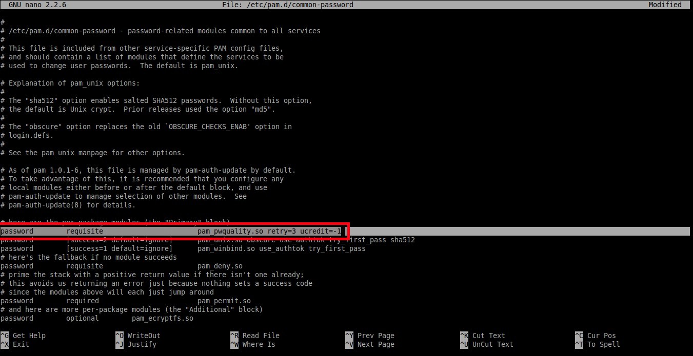 为了设置密码中至少有一个大写字母,则在下面这行的末尾添加文字 ucredit=-1。