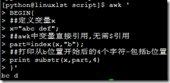 #index 简介è Index(s,t) 返回子串t在字符串s中的位置,如果没有指定s,返回0 ###案例1<index函数>: awk ' BEGIN{ ##定义变量x x="abc def"; ##awk中变量直接引用,无需$引用 part=index(x,"b"); ##打印从b位置开始后的4个字符-包括b位置 print substr(x,part,4) }' 结果: