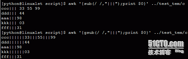 替换函数: Sub(); 只替换一个位置 gsub() 替换所有 g为global意思 Sub(r,s,t) 在字符串t中用s替换正则表达式r的首次匹配,t默认为$0 Gsub(r,s,t) 在字符串t中用字符串s替换和正则表达式r匹配的所有字符串,返回替换的个数,如果没有给出t,默认$0 awk '{gsub(/ /,"\n")}END{ print $0}' abc awk '{sub(/ /,"|||");print $0}' ../test_tem/c
