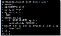 SUBSEP 多维数组分割符 awk ' BEGIN{ ##二维数组定义 ay[1,10]="a"; ay[10,2]="b"; }END{ for(k in ay) ##二维数组提取(split) {split(k,idx,SUBSEP); print idx[1],idx[2],ay[idx[1],idx[2]];} }' /dev/null