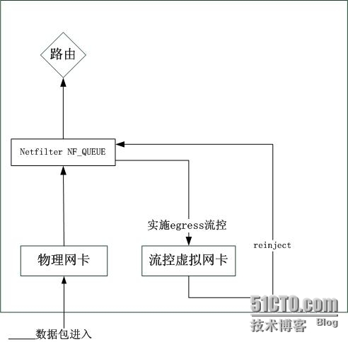 方案2:构建一个Netfilter HOOK,在其target中将希望流控的数据NF_QUEUE到虚拟网卡,即在queue的handler中设置skb->dev为虚拟网卡,调用dev_queue_xmit(skb)即可,而该虚拟网卡则不再符合上面的图示,新的原理图比较简单,只需要在虚拟网卡的hard_xmit中reinject数据包即可。(事实上,后来我才知道,原来IMQ就是这么实现的,幸亏没有动手去做无用功)