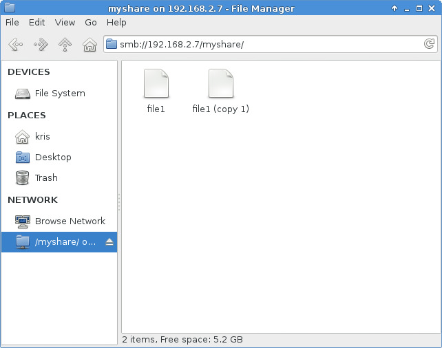 接下来是在Thunar文件管理器中访问Samba共享文件夹以及对file1进行拷贝复制的截图。注意,Samba的共享内容可以通过在Thunar中通过 smb://<samba-server-IP-address>/myshare 这个地址来访问。