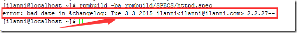 三、httpd.spec文件示例 下面就以系统提供的spec文件为模版,把apache源码包制作成rpm包。apache的spec文件如下: Name: httpd Version: 2.2.27 Release: 1%{?dist} Summary: compiled from 2.2.27 by ilanni Group: System Environment/Daemons License: GPL URL: http://www.ilanni.com Source0: httpd-2.2.27.tar.gz BuildRoot: %(mktemp -ud %{_tmppath}/%{name}-%{version}-%{release}-XXXXXX) BuildRequires: gcc, gcc-c++, openssl-devel %description Apache web server. Compiled from 2.2.27 by ilanni %prep %setup -q %build ./configure –prefix=/usr/local/httpd –enable-so –enable-rewrite –enable-cgi –enable-ssl –enable-charset-lite –enable-suexec –with-suexec-caller=daemon –with-suexec-docroot=/usr/local/httpd/htdocs make %{?_smp_mflags} %install rm -rf %{buildroot} make install DESTDIR=%{buildroot} %clean rm -rf %{buildroot} %files %defattr(-,root,root,-) /usr/local/httpd/bin/* /usr/local/httpd/build/* /usr/local/httpd/cgi-bin/* %config /usr/local/httpd/conf/* /usr/local/httpd/error/* /usr/local/httpd/htdocs/* /usr/local/httpd/icons/* /usr/local/httpd/include/* /usr/local/httpd/lib/* %dir /usr/local/httpd/logs %doc /usr/local/httpd/man/* %doc /usr/local/httpd/manual/* /usr/local/httpd/modules/* %post cp /usr/local/httpd/bin/apachectl /etc/init.d/httpd sed -i ‘1a # chkconfig: 2345 85 15’ /etc/init.d/httpd sed -i ‘2a # description: apache web server’ /etc/init.d/httpd chkconfig –add httpd %preun /etc/init.d/httpd stop chkconfig –del httpd %changelog * Tue Mar 3 2015 ilanni<ilanni@ilanni.com> 2.2.27 —