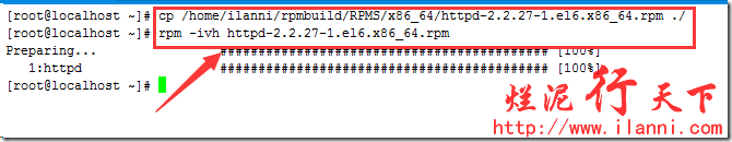 通过上图,我们可以很明显的看出rpm包已经制作成功。 新生成的rpm包存放在rpmbuild/RPMS/目录下,而源码rpm包则存放在rpmbuild/SRPMS/目录下。 注意:rpmbuild –ba命令的意思是编译后做成*.rpm包和src.rpm包。 七、测试生成RPM包 rpm包制作完成后,我们来测试该rpm包。如下: cp /home/ilanni/rpmbuild/RPMS/x86_64/httpd-2.2.27-1.el6.x86_64.rpm ./ rpm -ivh httpd-2.2.27-1.el6.x86_64.rpm