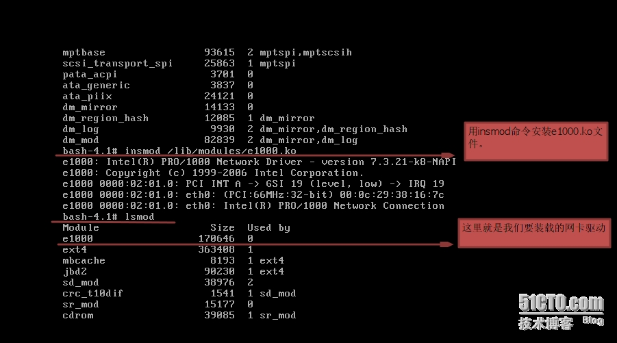 上边的e1000就是我们要找的网卡模块,你是不是该问,那还是没有解决问题呀,e1000在哪呢。我们别忘了还有一个modinfo命令呢。