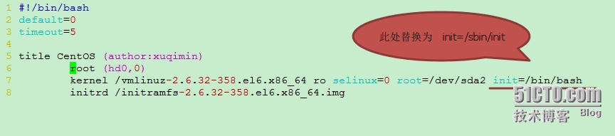 不过需要注意的是,如果想让他开机自动生效,需要在grub.conf中定义,让init指向此脚本所在的路径。