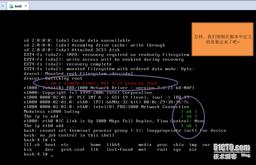 [root@station57 mnt]# vim /mnt/sysroot/sbin/init 1 #!/bin/bash 2 # 3 echo -e "\t\033[31;5mI am a simple Linux, but I'll grow up soon\033[0m" 4 5 insmod /lib/modules/e1000.ko && echo -e "Moduless e1000 loding\033[60G\033[32m[ ok ]\033[0m " || echo "Moduless e1000 loging error" 6 ifconfig lo 127.0.0.0/16 && echo -e "The ip lo add ...\033[60G\033[32m[ ok ]\033[0m " || echo "ip of lo add error" 7 ifconfig eth0 172.16.20.11/16 && echo -e "The ip eth0 add ...\033[60G\033[32m[ ok ]\033[0m " || echo "ip of eth0 add error" 8 /bin/bash :::::别忘了最后启动shel呀!