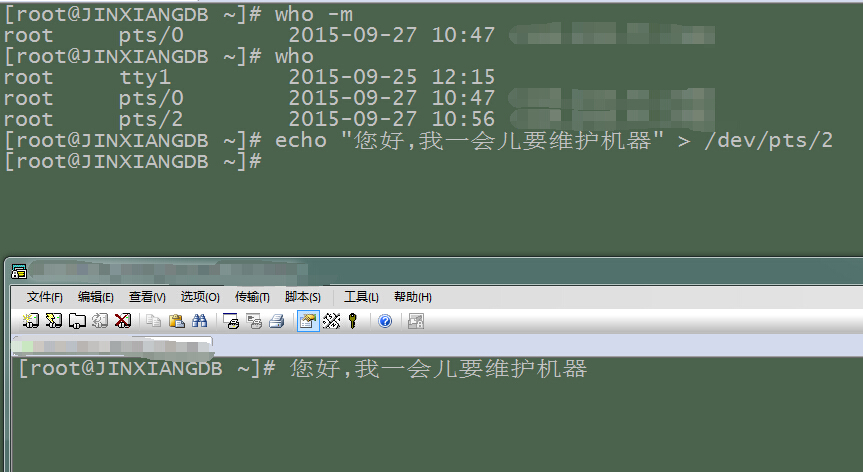 如果多人同时登陆服务器,此时如果需要向对方窗口发送消息,可以通过echo方式简单实现。 格式是: echo “内容” > /dev/pts/x /dev/pts/x 对方使用的tty可由who 或who -m命令确定,具体方法如下: