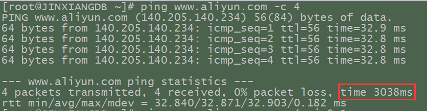 ping目标地址时延时都不高,但总时间却非常高。 比如下图测试对阿里云官网ping 4个包,每个包基本在35ms以内,但总体时间却经过3000多ms