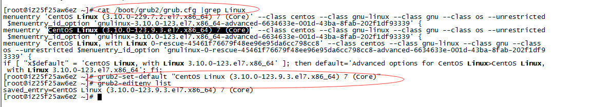 #cat /boot/grub2/grub.cfg |grep Linux //查看当前可以启动的内核项; #grub2-set-default "CentOS Linux (3.10.0-123.9.3.el7.x86_64) 7 (Core)" //设置默认启动的内核项 #grub2-editenv list // 验证当前默认启动的内核项;