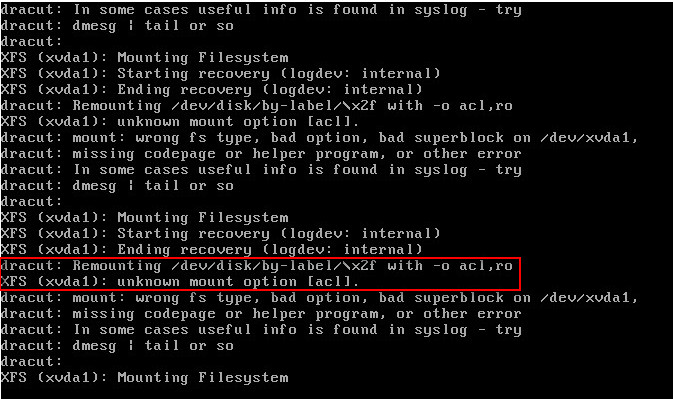 如上信息:尝试重新挂载文件系统为x2f文件系统(ext3或ext4)并且有挂载选项acl和ro。 可以看到xvda1这个系统分区的文件系统是XFS的文件系统,不是常规的ext3和ext4的文件系统,但是有一个未知的挂载选型acl。 根据报错信息,再次进入系统把挂载的文件系统修改为xfs,并且去掉acl选项,尝试再次重启系统。