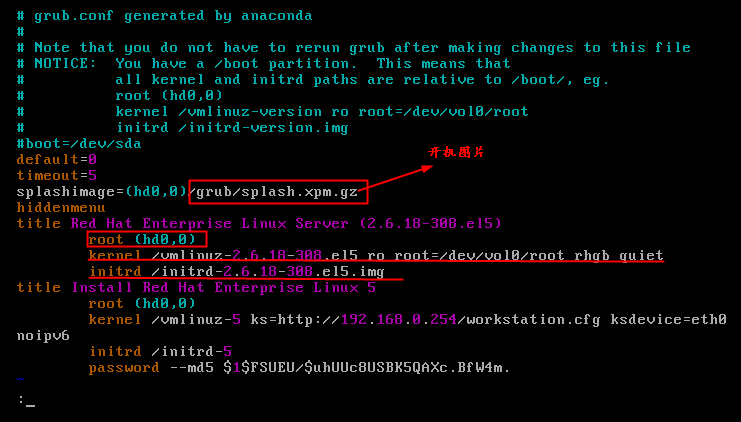 - 从grub的配置文件中我们看到了我们熟悉的开机图片