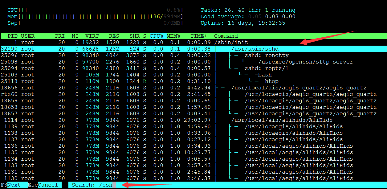 鼠标点击Search或者按下F3 或者输入"/", 可以通过输入进程名进行搜索,例如搜索ssh进程