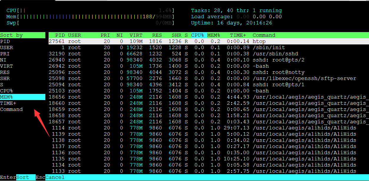 按下F6可以选择依照哪一列来排序,最常用的排序内容就是cpu和memory