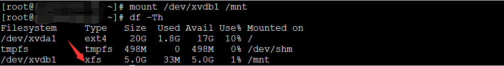 4. 挂载数据盘到某个目录,例如: mount /dev/xvdb1 /mnt 挂载之后可以通过df命令检查,可以看到数据盘已经挂载到/mnt目录,且文件格式是XFS。