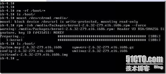 现在我们用chroot /mnt/sysimage,进入我们的系统环境,然后我们挂一下我们的光盘,然后强制安装一下kernel-2….这个包,这个过程会生成我们的/boot下的文件,下图我们也用ls /boot验证了
