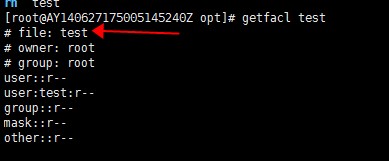 使用getfacl命令查看文件的acl权限。 [root@AY140627175005145240Z opt]# getfacl test # file: test # owner: root # group: root user::r-- group::r-- other::r--