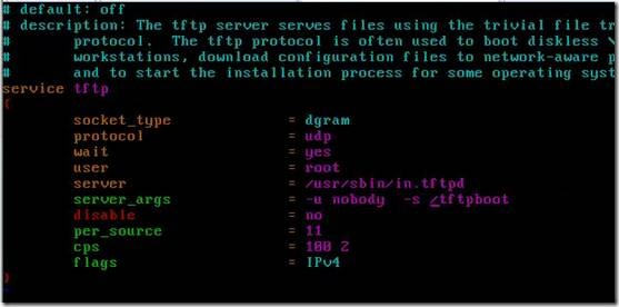 我规划的目录就是在根下/tftpboot,所以在server_Args那里我就写了/tftpboot,我还加了-u nobody,所有人可访问,并把disable=yes换成disable=no,默认是OFF,上面的注释已经说了