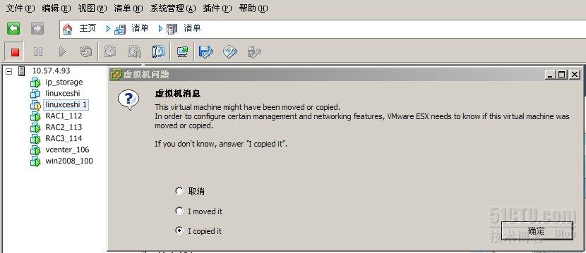 弹出提示,询问这个虚拟机是移动的还是复制的,选择“I coyied it”,确定。