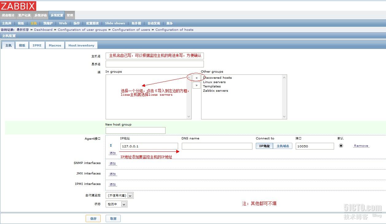 2、设置主机名字------监控主机所属组------监控主机IP地址---所属模板
