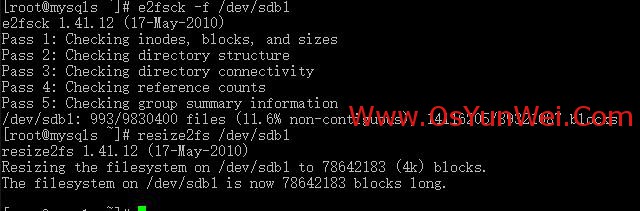 3、调整分区 e2fsck -f /dev/sdb1 #检查分区信息 resize2fs /dev/sdb1 #调整分区大小
