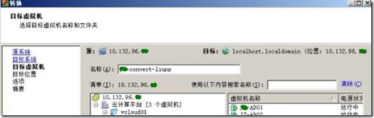 7. 在下图中,需要对转换的虚拟机进行命名,同时选中该虚拟机转换到vcenter云管理平台中,其所处的虚拟机清单,如下图1.7所示。