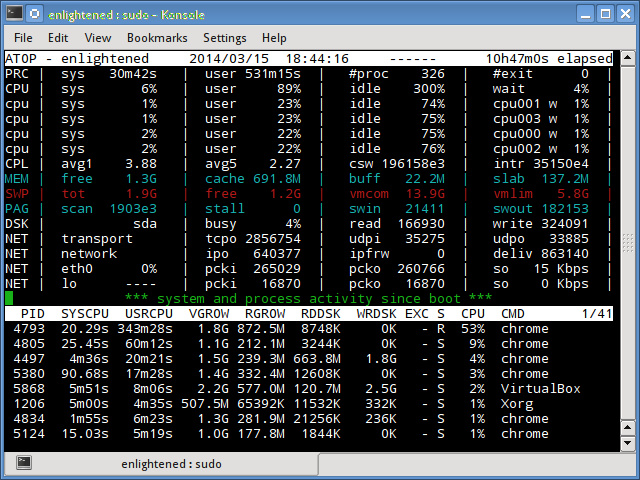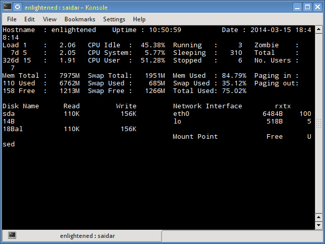 Saidar是所有命令行工具中最简单的,它的输出包括CPU、进程、负载、内存、交换、网络I/O、磁盘I/O和文件系统信息的统计。它的输出不包括现在运行中的进程。