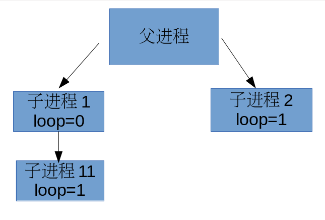 子进程11接着子进程1执行的代码开始执行(即fork后面),它也是打印出它的ID和父进程ID(子进程1),然后此时loop的值再加1就等于2了,所以子进程2直接就返回了。