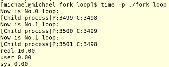 上图中那个loop=%d就是当这个进程开始执行的时候loop的值。上面那段代码的运行结果如下图: