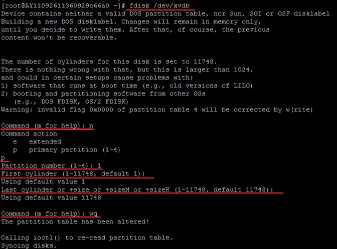 执行“fdisk /dev/xvdb”命令,对数据盘进行分区; 根据提示,依次输入“n”,“p”“1”,两次回车,“wq”,分区就开始了,很快就会完成。