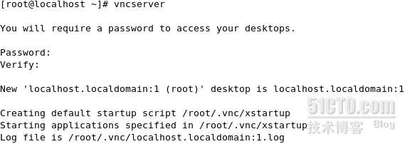 由于是第一次启动VNC的服务,需要输入密码,密码被加密保存在/root/.vnc/passwd中,同时在用户主目录下的.vnc子目录中为用户自动建立xstartup配置文件,在每次启动VNC服务时候,都会读取该文件中的配置信息,在/root/.vnc/目录下还有一个*:1.pid文件,这个文件记录着启动VNC后对应操作系统的进程号,用于停止VNC服务时准确定位进程号,还有一个*:1.log,为日志文件。启动vncserver后,默认为命令行登陆,New ‘localhost.localdomain:1(root)’ desktop is localhost.localdomain:1表示启动了一个新桌面,登陆后拥有root权限,桌面号为1,这个在登陆时需要,务必记住