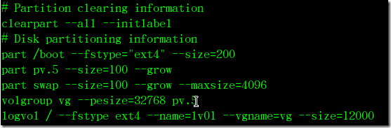 在rhel6中,如果system-config-kickstart创建配置文件时,在分区的时候不会出现LVM选项的,为了以后维护方便,我这里在ks.cfg中定义了划分LVM选项: