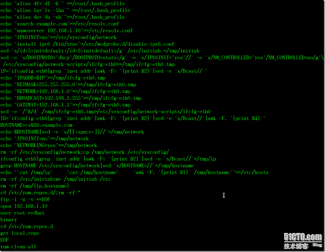 以上脚本包含了禁用IPV6、下载yum仓库配置文件、定义命令别名、设置DNS客户端、设置默认的启动级别、定义主机名等。