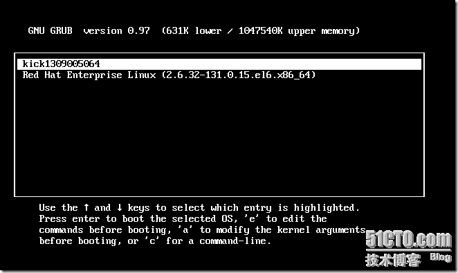 命令敲完后,注意上述命令输出中的—title=kick1309005064字符串,这个会添加在当前系统的grub.conf文件中,当重启系统后就会看到,如下图所示: