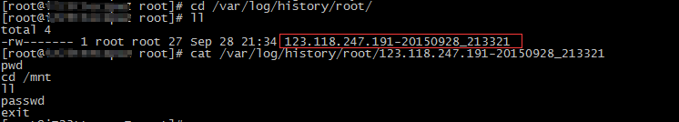 此日志需要重新登录后才可以看到,/var/log/history就是日志保存目录,此目录下的root目录保存的是root用户的操作记录。文件名称123.118.247.191-20150928_213321代表登录IP为123.118.247.191登录日期为2015年09月28日21点33分21秒,里面记录的就是登录后执行的操作命令。