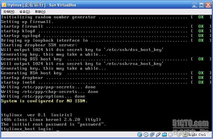 ttyLinux号称是最小的Linux系统,这两天找到了一个很好用虚拟机Virtual Box,这个虚拟机是SUN开发的一个免费开源的虚拟机,原来一直用 vmware,不过发现SUN的这个免费的虚拟机更好用,主要是比较轻量级的,感觉挺好。