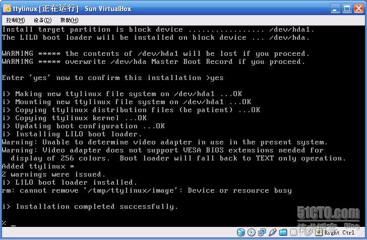 19.在“%”提示符下输入:ttylinux-installer -m /dev/hdc /dev/hda1