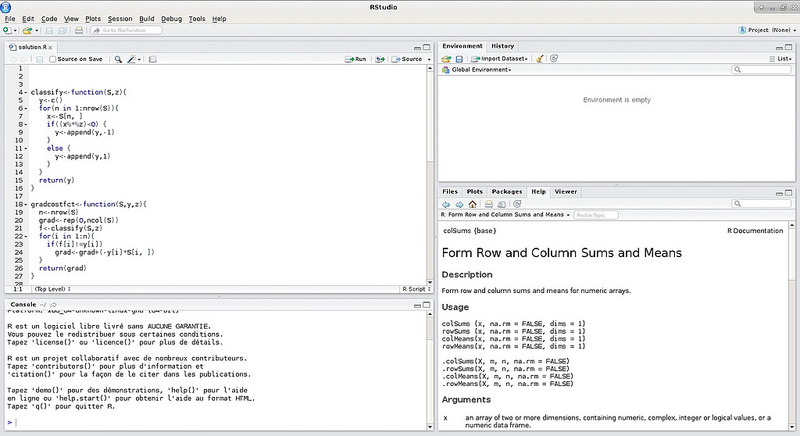 就让我们以或许是最为人们喜爱的 R IDE —— RStudio 来开始我们的介绍吧。除了一般 IDE 所提供的诸如语法高亮、代码补全等功能,RStudio 还因其集成了 R 语言帮助文档、强大的调试器、多视图系统而突出。如果你准备入门 R 语言,我只建议你将 RStudio 作为你的 R 语言控制台,一方面用它来实时测试代码是很完美的,另外对象浏览器可以帮助你理解你正在处理的是哪类数据。最后,真正征服我的是它集成了图形显示器,使得你能够更轻松地将图形输出为图片文件。至于它不好的方面, RStudio 缺乏快捷键和高级设置来使得它成为一个完美的 IDE。然而,它有一个以 AGPL 协议发布的免费版本, Linux 用户没有借口不去试试这个 IDE。 2. 带有 ESS 插件的 Emacs