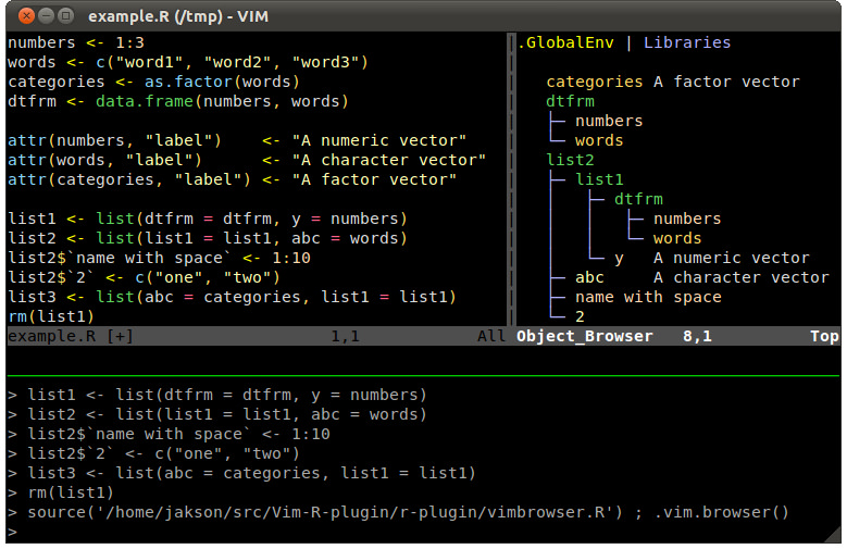在我的前一个有关 IDE 的文章中,很多朋友对我所给出的清单中没有 Emacs 而感到失望。对于这个,我的主要理由是 Emacs 可以说是 IDE 里面的“通配符”:你可以将它放到任意语言的 IDE 清单中。但对于 带有 ESS 插件的 R 来说,事情就变得有些不同了。Emacs Speaks Statistics (ESS) 是一个令人惊异的插件,它将完全改变你使用 Emacs 编辑器的方式,真的非常适合 R 编程者的需求。与 RStudio 类似,带有 ESS 的 Emacs 拥有多视图,它有两个面板:一个显示代码,另一个则是一个 R 控制台,使得实时地测试代码和探索数据对象变得更加容易。但 ESS 真正的长处是可以和你已安装的其他 Emacs 插件无缝集成,以及它的高级配置选项。简而言之,如果你喜欢你的 Emacs 快捷键,你将能够在 R 语言开发环境下使用它们。然而,当你在 ESS 中处理大量数据时,我已经听闻并经历了一些效率低下的问题。尽管这个问题不是很重大,但足以让我更偏好 RStudio。 3. Vim 及 Vim-R-plugin